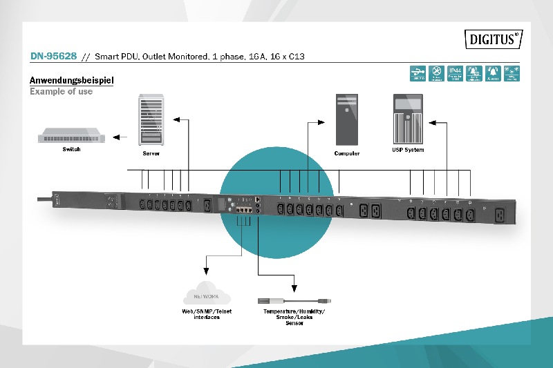 Optimální PDU řešení s možnostmi vzdáleného monitorování pro náročné IT požadavky Podporuje vzdálený přístup přes web, SNMP nebo Telnet Monitorování vstupních a výstupních hodnot Konfigurovatelný systém s uživatelem definovaným nastavením prahové hodnoty Daisy řetězení možné až pro 5 PDU 180 stupňový otočný místní HD displej Podporuje funkce alarmu Monitorování prostředí racku pomocí volitelných externích senzorů Inteligentní integrace do centrálního systému Podporuje instalaci bez použití nástrojů DIGITUS® Smart PDU vám nabízí možnost vzdáleného sledování proudu, napětí, celkové spotřeby energie, celkového výkonu a výkonu na vstupní úrovni, jakož i aktuální, napájecí a energetické spotřeby na výstupní úrovni. Limitní hodnotu lze nastavit pro celkový proud a alarm vás upozorní na potenciální přetížení systému. Je také povoleno sledování provozního stavu, stejně jako proudu, energie a výkonu na úrovni jističe. To umožňuje efektivní správu a distribuci energie. K zařízení lze přistupovat a konfigurovat je prostřednictvím webových, SNMP a Telnetových rozhraní. S možností připojení senzorů může jednotka obsahovat kompletní systém monitorování prostředí pro řízení teploty, kouře, vlhkosti a netěsností v regálech. Až pět napájecích proužků, které sdílejí stejné síťové připojení a IP adresu, lze připojit sériově. Kromě toho lze PDU snadno integrovat do regálů s možnostmi instalace bez nástrojů. Technické detaily Monitorování vstupního proudu / napětí / celkové spotřeby energie / celkový výkon / výkonový faktor Sledování výstupního proudu / celkové spotřeby energie / celkového výkonu Metoda vzdáleného přístupu: Webové rozhraní, HTTP, HTTPS, SNMP (v1 / v2c / v3), Telnet a sériová konzole Řetězení daisy až pěti PDU (včetně hlavního zařízení) Vícestupňový přístup uživatelů Kompatibilní se senzory teploty/vlhkosti/kouře/netěsnosti Uživatelsky definovaný alarm: E-mailové oznámení a poplašný signál při překročení prahových hodnot pro celkový proud, teplotu / vlhkost Standardní systémový alarm: Pokud je překročen celkový jmenovitý výkon; pokud je detekován kouř, voda nebo otevřené dveře Připojení RJ45 pro Ethernet a sériovou komunikaci USB Port pro přístup k WIFI nebo upgrade softwaru Síťový kabel: 3 x 2,5 mm2, IEC60309 16 Zástrčka Kabel: 3 m Max. zatížení: 4000 W / 250 V AC / 16 A (50/60 Hz) Zásuvky: zásuvka 16 x C13 Výstupní výkon: C13 (10A) 180 stupňový otočný HD displej Rozměry (LxWxD): 1730 x 66 x 52 mm Teplotní rozsah (provoz / skladování): 0 °C až +45 °C/ -20 °C až +70 °C Rozsah vlhkosti (provoz / skladování): 5% - 95% RH / 5 - 95% RH (nekodenzace) Maximální výška nad mořem (provoz / skladování): 0 - 3 000 m / 0 - 15 000 m Barva: Černá Typ ochrany: IP44 Obsah balíčku 1 x Smart PDU, zásuvka monitorovaná, 1fázová, 16 x C13, 3 m kabel IEC 60309 16 Zástrčka |