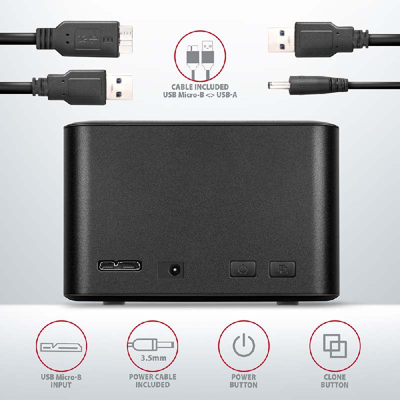 SuperSpeed USB 5 Gbps dokovací / klonovací stanice AXAGON ADSA-D25 CLONE MINI připojí k počítači snadno a rychle až dva 2.5" disky současně. Připojení k počítači umožňuje USB Micro-B konektor na doku spolu s dodávaným kabelem USB Micro-B --- USB-A.