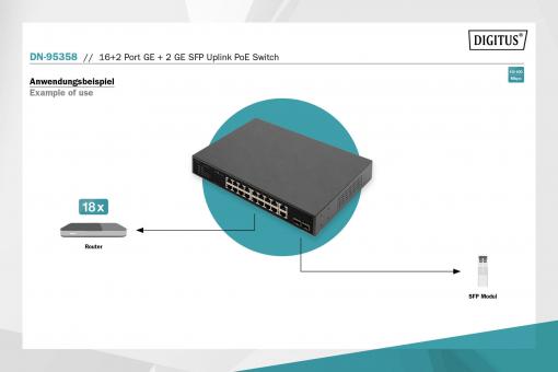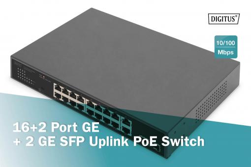 16+2 porty GE + 2GE SFP uplink PoE přepínač 16+2 porty 10/100/1000 Mb/s + 2GE SFP PoE switch