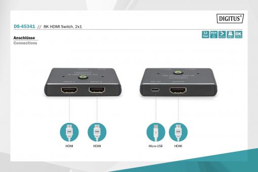 Pohodlné přepínání mezi dvěma zdroji signálu 8K HDMI stisknutím tlačítka nebo automatickou detekcí - bez problémů s opětovným zapojením kabelů. Podporuje rozlišení až 8K/60Hz HDMI 2.1 Spínání zdroje signálu pomocí přepínače Automatická detekce: Pokud jsou připojeny dva zdroje, spínač detekuje, který je zapnutý a změní tento vstup Plug & Play Přenosová rychlost: až 48 Gb/s Podporuje HDR (vysoký dynamický rozsah) Napájení pomocí kabelu Micro-USB Podporuje rychlosti signálu HDMI 2.1, 2.0 a 1.4 POPIS Pohodlné přepínání mezi dvěma zdroji signálu HDMI stisknutím tlačítka nebo automatickou detekcí - bez problémů s opětovným zapojením kabelů. Podporuje rozlišení až 8K/60Hz. Napájení je zajištěno pomocí přiloženého kabelu Micro-USB. TECHNICKÉ ÚDAJE 2x vstup HDMI 1x HDMI výstup 1x přepínač 1x Micro-USB vstup 2x stavová LED Podporuje rozlišení až 8K/60Hz HDMI 2.1 Spínání zdroje signálu pomocí přepínače Automatická detekce: Pokud jsou připojeny dva zdroje, spínač detekuje, který je zapnutý a změní tento vstup Plug & Play Přenosová rychlost: až 48 Gb/s Podporuje HDR (vysoký dynamický rozsah) Napájení pomocí kabelu Micro-USB Podporuje rychlosti signálu HDMI 2.1, 2.0 a 1.4 Pouzdro: hliník Rozměry: D 7 x Š 5.7 x V 1.3 cm Hmotnost: 50 g Barva: Černá OBSAH BALENÍ 1x 8K HDMI přepínač, 2x1 1x Micro USB kabel, 100 cm 1x QIG |