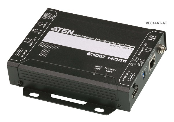 ATEN VE814AT je HDBaseT Video Transmitter, který je schopen odesílat signály HDMI až na 100 m přes jeden kabel Cat 5e/6/6a nebo ATEN 2L-2910 Cat 6. Díky dvěma synchronním výstupům může VE814AT přenášet video signál na dva vzdálené displeje a jeden na místní straně. Tento vysílač kompatibilní s HDCP 2.2 splňuje specifikaci HDMI, včetně 3D, Deep Color, maximální přenosové rychlosti (10,2 Gbps) a kvality videa 4K až na 100 m.