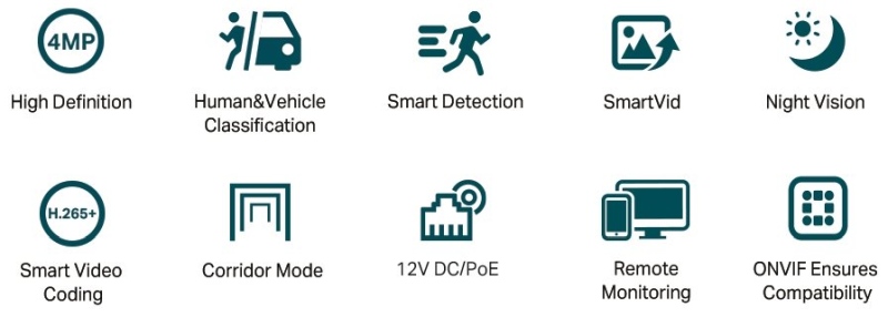 Kameru je možné napájet jak přes 12V DC konektor, tak přes 802.3af PoE po ethernetovém kabelu. Klíčové vlastnosti Rozlišení 4MP Objektiv 4mm, pozorovací úhel 75° IR na 30m Podpora DWDR a 3D DNR (1) 10/100 Mbps LAN Napájení 802.3af PoE nebo 12V DC jack, max. spotřeba 5W Rozlišení osob a vozidel: Rozlišuje lidi a vozidla od ostatních objektů, takže dostáváte přesnější oznámení o událostech Režim chodby: Umožňuje změnit poměr stran obrazu z 16:9 na 9:16 a pomáhá tak sledovat dlouhé a úzké oblasti Inteligentní detekce: Přijímejte oznámení a kontrolujte kanály, když někdo překročí hranici, vstoupí do nastavené oblasti Technické parametry Kamera WDR:Digitální Typ objektivu:Fixní Objektiv [mm]:4 (fixní) Přísvit:IR Dosah přísvitu [m]:30 Pozorovací úhel [°]:75 Režim den/noc:IR cut filtr Citlivost senzoru [Lux]:0,1 Obrazový senzor ["]:1/3 Obraz Rozlišení:4MP Max. rozlišení [pixely]:2560 x 1440 (WQHD) Konektory a rozhraní Rychlost LAN:(1) 10/100Mbps Napájení Napájení přes PoE:802.3af Typ napájení:PoE, DC konektor Max. spotřeba energie [W]:5 Napájení přes konektor/svorkovnici:12V DC Fyzické charakteristiky Použití:Vnitřní Provozní teplota [°C]:-30 až 60 Šířka [mm]:123 Výška [mm]:84 Hloubka [mm]:123 Barva:Bílá Kompresní standardy Datový tok:64Kbps ~ 4Mbps Počet streamů:2 Video komprese:H.264, H.265 Obecné Kamerová řada:VIGI Obsah balení Zařízení Šroubky |