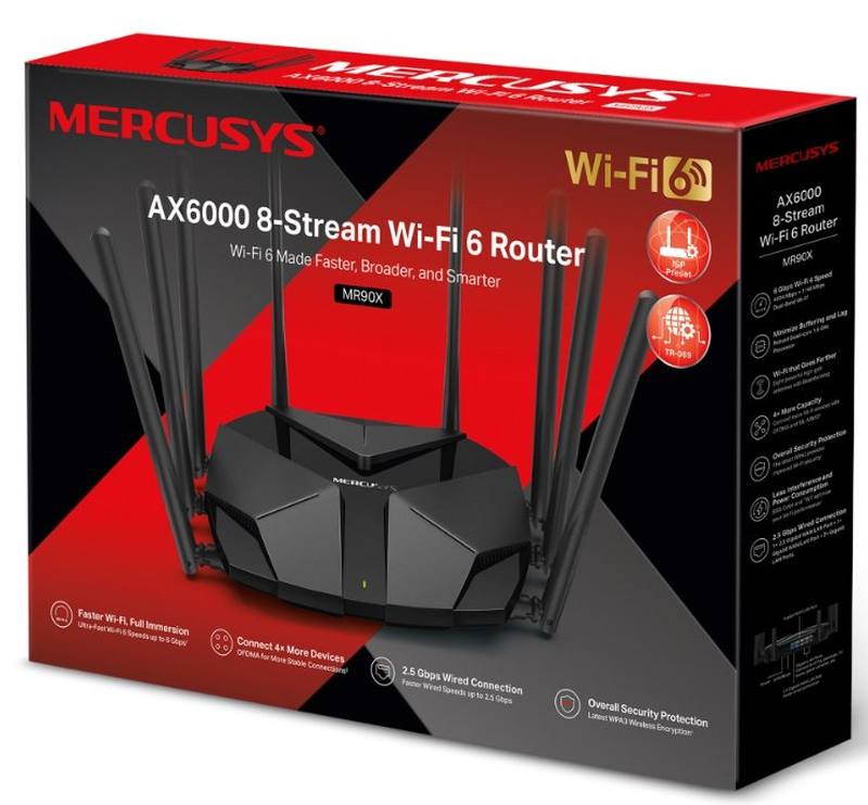Bezdrátový router od výrobce Mercusys představuje vysoce výkonný Dual Band Wi-Fi 6 router, specificky koncipovaný pro domácí využití a vysokou rychlost. S implementací Dual Band Wi-Fi 6, podporou standardů 802.11a/b/g/n/ac/ax a technologií 4x4 MIMO nabízí přenosovou rychlost 4804 Mbps v pásmu 5 GHz a 1148 Mbps v pásmu 2.4 GHz. Díky osmi statickým anténám a využití pokročilých technologií, jako jsou OFDMA, MU-MIMO, šifrování WPA3 a Beamforming, zaručuje stabilní a zabezpečené připojení. Router rovněž poskytuje podporu VPN protokolů OpenVPN a PPTP, což výrazně přispívá k celkové bezpečnosti připojení. Router disponuje (2) Gigabit LAN + (1) Gigabit LAN/WAN + (1) 2.5 - Gigabit WAN porty, čímž uspokojí požadavky na vysokorychlostní přenos dat. Router má nádherný moderní design, a proto se řadí mezi optimální volby pro moderní domácnosti.