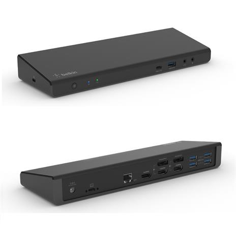Vytvořte výkonnou pracovní stanici doma nebo v kanceláři s naším univerzálním USB-C trojitým dokem pro zobrazení. Náš pokročilý dok využívá technologii DisplayLink™* k poskytnutí univerzální kompatibility s videem pro notebooky MacBook, Windows a Chromebook, takže můžete zobrazit až na třech dalších obrazovkách v rozlišení videa až 4K. Obsahuje 5x video výstupy (3x HDMI®, 2x DisplayPort), Gigabitový ethernet, 5x USB-A, USB-C a další, což vám poskytuje pohodlný přístup k vysokorychlostnímu internetu, více displejům, zařízením a perifériím. Také poskytuje až 85W dodávky energie, abyste udrželi váš notebook a další zařízení napájená a připojená.
