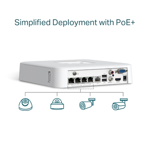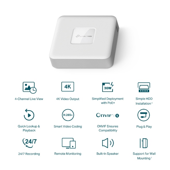 Zařízení TP-Link VIGI NVR1104H-4P s 4K HDMI video výstupem zaznamenává videa z bezpečnostních kamer a usnadňuje jejich správu. Poskytne vám vysoké rozlišení obrazu až 8MP. Ohlídáte si dění na svém pozemku či ve svém podniku (prodejna, sklad, restaurace, penzion). 4kanálový displej vám zobrazí záběry ze 4 kamer najednou. Neuteče vám tedy žádný detail.