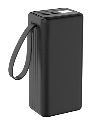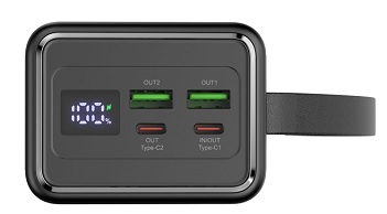 Je vybaven několika výstupními porty, včetně dvou standardních portů USB-A a dvou portů Type-C, z nichž jeden slouží k nabíjení samotné powerbanky. Porty USB nabízejí výstup 5V/4,5A, 5V/3A, 9V/2A a 12V/1,5A, zatímco port typu C nabízí výstup 5V/3A, 9V/3A, 12V/3A, 15V/3A, 20V/3,25A (PD65W), který umožňuje rychlé nabíjení různých zařízení.