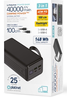 "PMPB4065 je vysokokapacitní nabíjecí power banka, která nabízí rychlé a efektivní napájení elektronických zařízení. S působivou kapacitou 40 000 mAh při 3,7 V (ekvivalent 29 600 mAh při 5 V) můžete své smartphony, tablety a další mobilní zařízení dobít několikanásobně, než budete muset powerbanku znovu připravit k použití.
