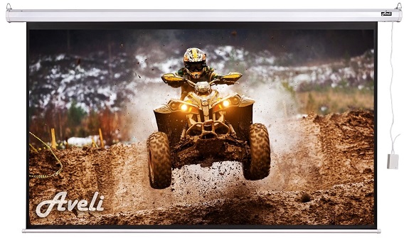 Projekční plátno roletové, rozměr 664 cm × 374 cm, úhlopříčka 300", poměr stran 16:9, matně bílé plátno, černé okraje, bílé tělo, k umístění na strop a na zeď, motor pro navíjení, s dálkovým ovládáním
